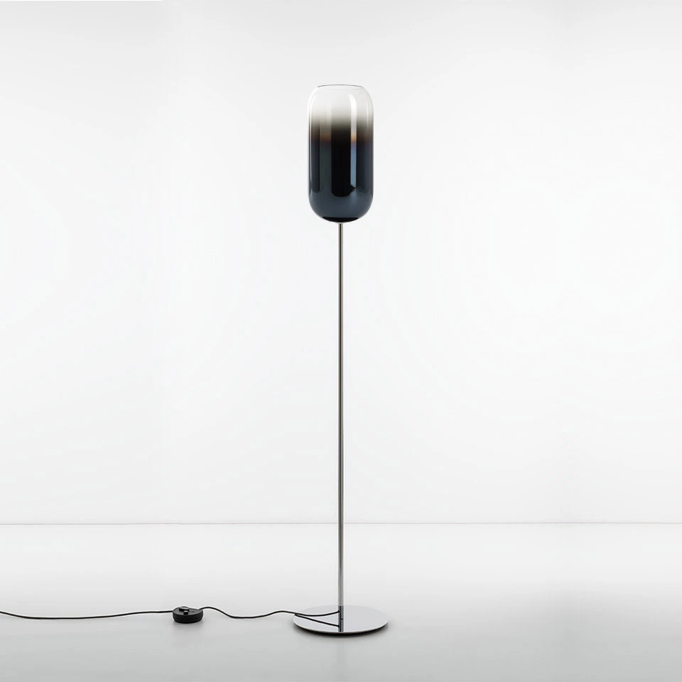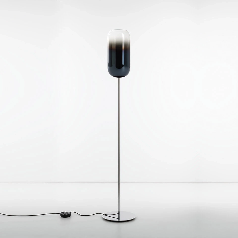 La forme de base de la lampe Gople rehausse la beauté du verre, traité à la main selon une ancienne technique vénitienne qui transforme progressivement le verre blanc en verre cristal en les combinant lors du soufflage, rendant ainsi chaque pièce unique. Des finitions plus innovantes sont ajoutées, notamment la métallisation sous vide argentée ou cuivrée. Les finitions argent, bronze, cuivre et bleu sont réalisées avec un processus innovant et durable de dépôt de métal sous vide. Du point de vue de l'écologie, la "pulvérisation" est la technologie de revêtement la plus propre pour le type de métal utilisé et parce que toutes les émissions sont éliminées, en particulier celles dans l'atmosphère d'acide sulfurique et de cyanures produits par les processus galvaniques. Une peinture solide avec jusqu'à 5% de solvants (comparé à 75% des produits traditionnels) est utilisée pour la phase de vernis protecteur ultérieure. Le processus génère très peu de déchets et la finition résultante est particulièrement résistante dans le temps. Dans tous ces cas, la finition en verre est conçue pour assurer la meilleure relation avec la lumière émise, filtrant la source et maximisant l'émission directe à travers la transparence. La version la plus basique avec l'articulation E27 ou E14 traditionnelle est conçue pour offrir différents niveaux de performance par rapport à la version plus innovante RWB, où les couleurs peuvent être combinées entre elles pour créer des paysages lumineux répondant aux exigences de l'espace. C'est une solution intemporelle pour sa flexibilité à s'adapter au développement des technologies de source standard.
