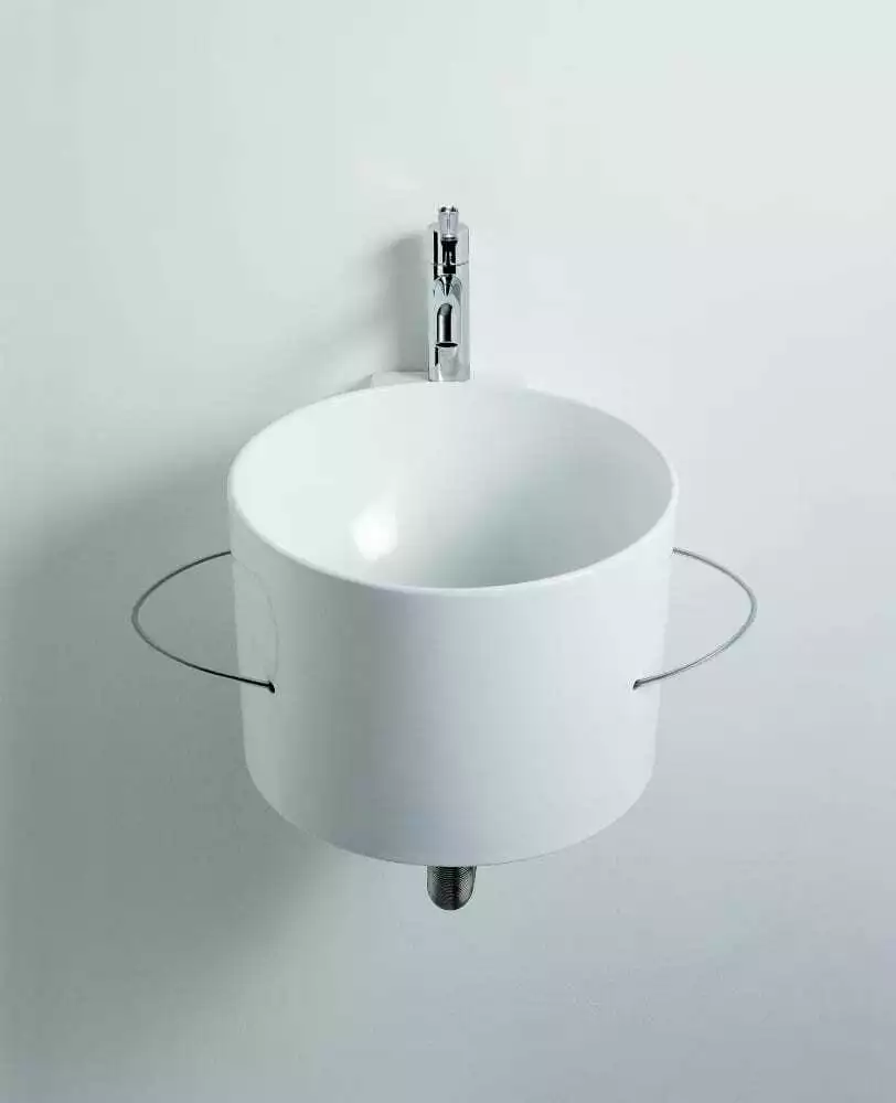 Lavabo circulaire en argile blanche sans trou de robinet, sans trop-plein, complet avec kit de fixation. Conçu pour le vidage .MET0563. Fourni avec des porte-serviettes latéraux en acier inoxydable gainé de plastique mat blanc, noir ou transparent.