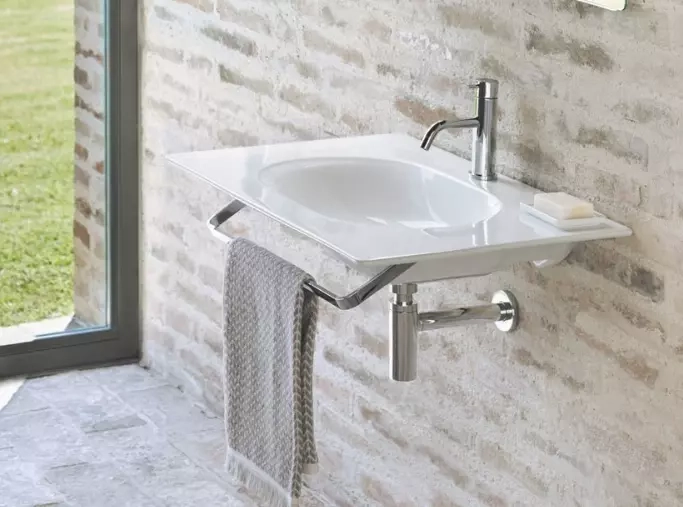 Installation suspendue au mur, sur cadre ou sur meuble à tiroirs. Sans trop-plein. Caractérisés par une surface extrêmement plate, les lavabos peuvent être installés au milieu, à droite ou à gauche des autres dessus en céramique, mais sur un modèle de 150 cm - disponible en deux versions - il est possible d'installer deux lavabos.