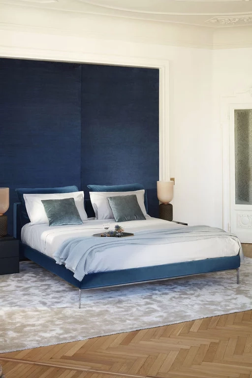 Surélevé du sol et présentant une ligne distinguée et essentielle, le lit Moov affiche l'évolution naturelle des concepts de confort et de style, déjà présents dans le canapé également conçu par Piero Lissoni. La forme élégante est caractérisée par le cadre de lit et la tête de lit rembourrés, avec une housse textile amovible ou une housse en cuir fixe. La structure de support est en contreplaqué de peuplier avec des pieds en aluminium moulé poli. Pour accompagner la tête de lit, des coussins d'oreiller sont fournis, maintenus par un rouleau cousu à l'arrière, donnant équilibre et harmonie. Le lit est complété par les tables de chevet Note de Piero Lissoni.