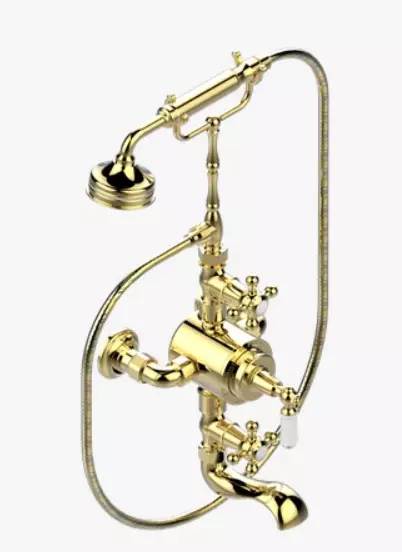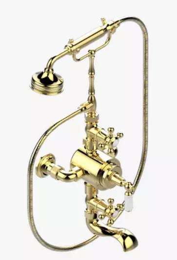 Mitigeur de baignoire/douche mural thermostatique, vannes d'arrêt, entraxe de 150 mm avec support de téléphone haut, douchette et tuyau de 1,50 m, sans pomme de douche. Images de l'article G29-11TRD