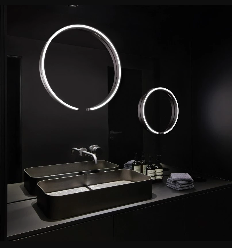 Transformer la lumière en une expérience : Mito sfera su offre un éclairage sans éblouissement et personnalisable. La lumière peut être allumée ou éteinte, gradée et sa température de couleur modifiée avec un contrôle par geste ou éventuellement via Occhio air. La qualité de la lumière est aussi proche que possible de la lumière du jour. Le luminaire peut être monté sur des surfaces miroitées de toute taille ou type. Lumière sans éblouissement et gradable - le luminaire peut être contrôlé à tout moment via un geste ou Occhio air. Pour une lumière réfléchie parfaite à tout moment. Le luminaire est disponible en deux versions - avec un diamètre de 40 cm ou 60 cm.