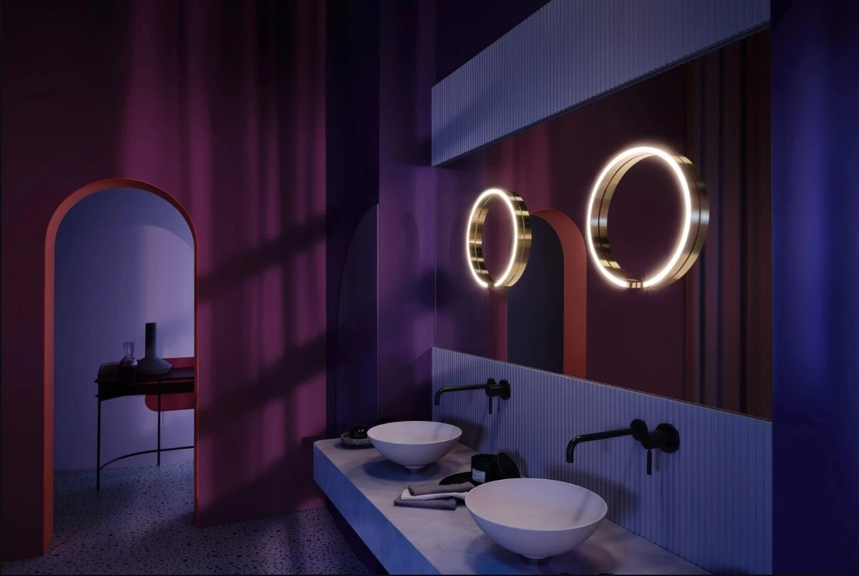 Transformer la lumière en une expérience : Mito sfera su offre un éclairage sans éblouissement et personnalisable. La lumière peut être allumée ou éteinte, gradée et sa température de couleur modifiée avec un contrôle par geste ou éventuellement via Occhio air. La qualité de la lumière est aussi proche que possible de la lumière du jour. Le luminaire peut être monté sur des surfaces miroitées de toute taille ou type. Lumière sans éblouissement et gradable - le luminaire peut être contrôlé à tout moment via un geste ou Occhio air. Pour une lumière réfléchie parfaite à tout moment. Le luminaire est disponible en deux versions - avec un diamètre de 40 cm ou 60 cm.