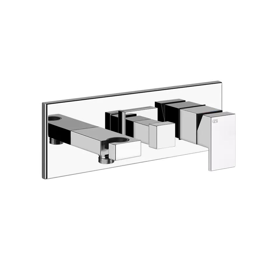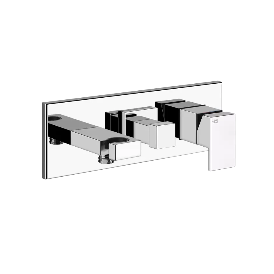 Pièces externes pour mitigeur de douche encastré deux sens avec inverseur, sortie d'eau, crochet de douchette. À compléter avec flexible et douchette. Les robinets Rettangolo sur pied, muraux et plafonniers non édités, les accessoires de salle de bains et autres produits, avec leur multitude de modèles, versions et éléments modulaires coordonnés, ont ouvert la voie à une liberté totale dans la conception de la salle de bains. Chaque propriétaire pouvait enfin accorder les meubles à son goût particulier, devenant le véritable créateur de son espace de vie.
