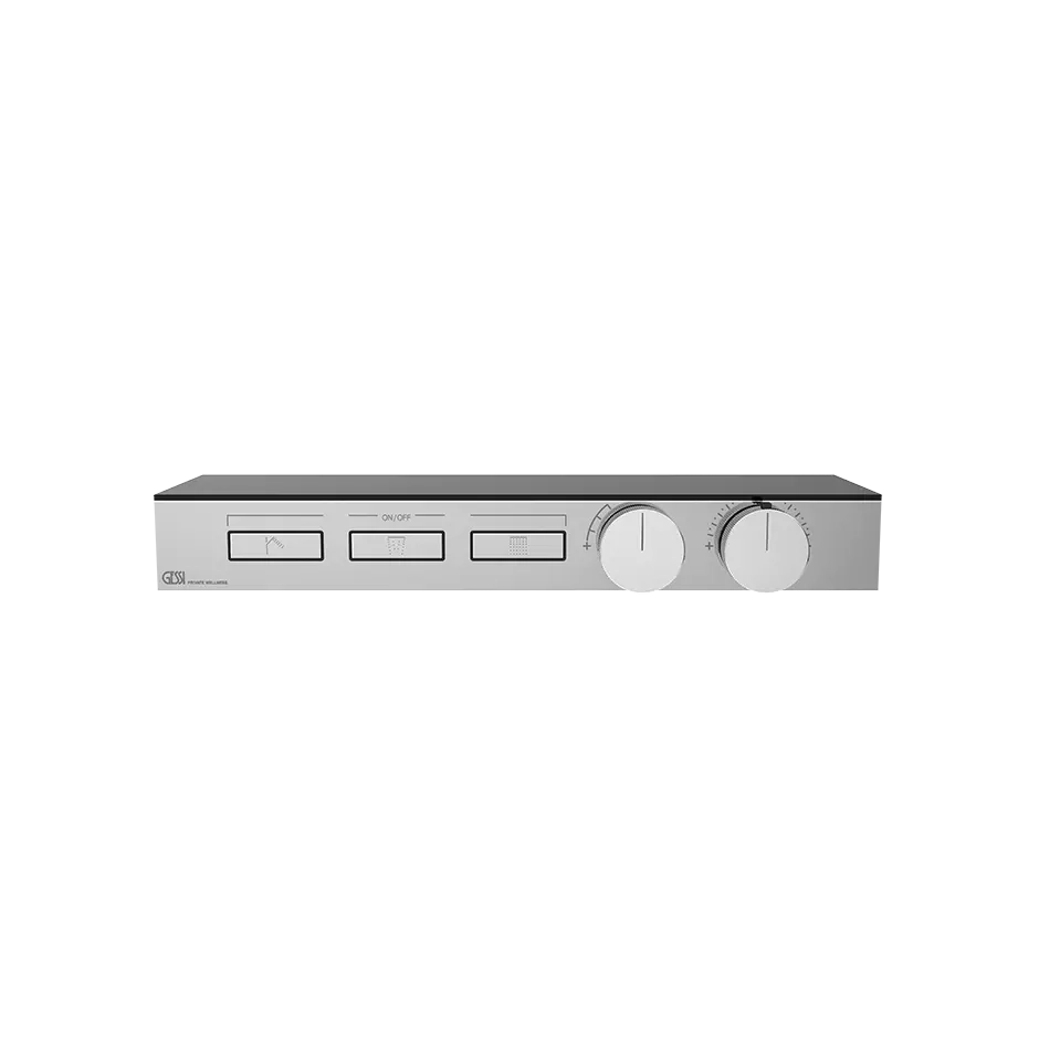 verre de sécurité dépoli noir. La Hi-Fi, la dernière création de Gessi, est la nouvelle frontière de son programme Private Wellness®. Le nom emblématique de cette collection souligne l'inspiration tirée de l'histoire de l'ingénierie acoustique pour les systèmes stéréo haute fidélité. Gessi Hi-Fi, bien au-delà de la simple esthétique, est une technologie haute fidélité pour l'eau, une ergonomie étudiée et une perfection fonctionnelle. Les commandes de précision ont été conçues pour recréer toutes les sensations tactiles des postes stéréo d'époque : le clic sur les boutons d'activation des fonctions légèrement saillants donne cette sensation typique d'antan, le tic-tac des boutons, la précision millimétrique des commandes, tout permet de régler et de maintenir la régulation privilégiée du débit et de la température.