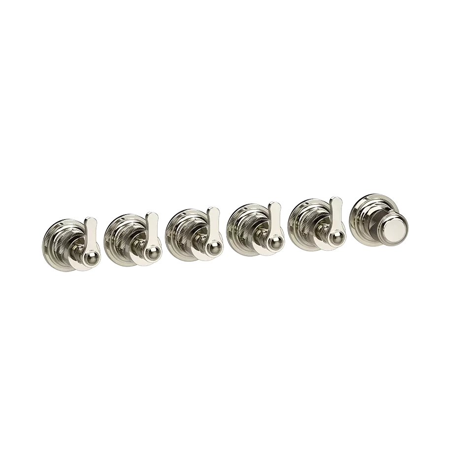 Pièces externes pour mélangeur thermostatique mural. Réglage vertical/horizontal avec cinq sorties séparées. La collection Venti20 absorbe l'enthousiasme de la vie et l'optimisme tourné vers l'avenir de cette époque et l'infuse dans les espaces les plus privés de la vie contemporaine.