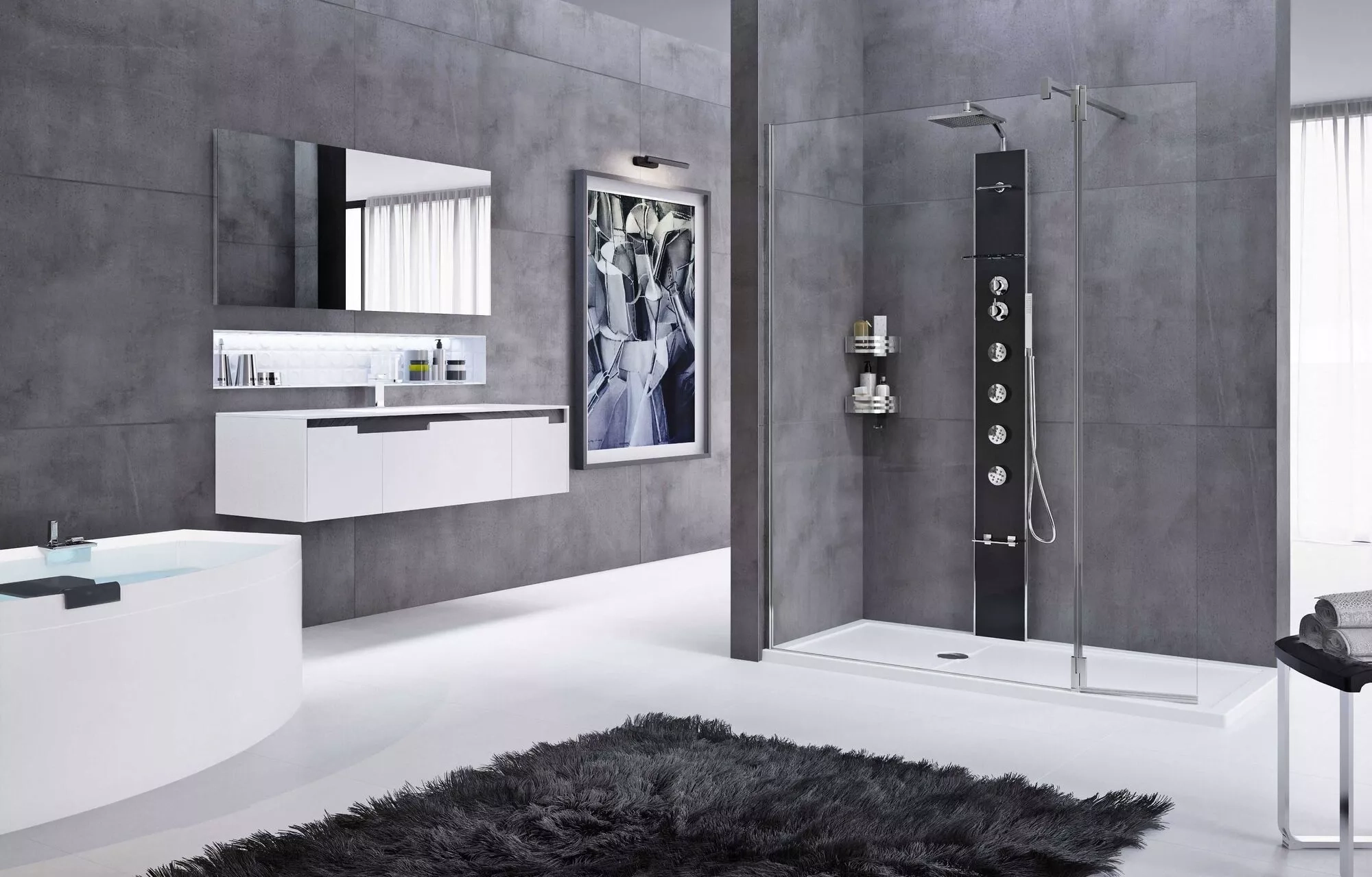 PANNEAU ÉQUIPÉ AVEC PROFILS LATÉRAUX EN ALUMINIUM ET FINITION EN ACRYLIQUE, DOUCHE DE TÊTE, INSTALLATION D'ANGLE OU MURALE