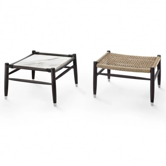 La famille Tessa comprend un fauteuil, un repose-pieds, un banc et une table basse avec plateau en marbre, disponible dans plusieurs types de marbre.