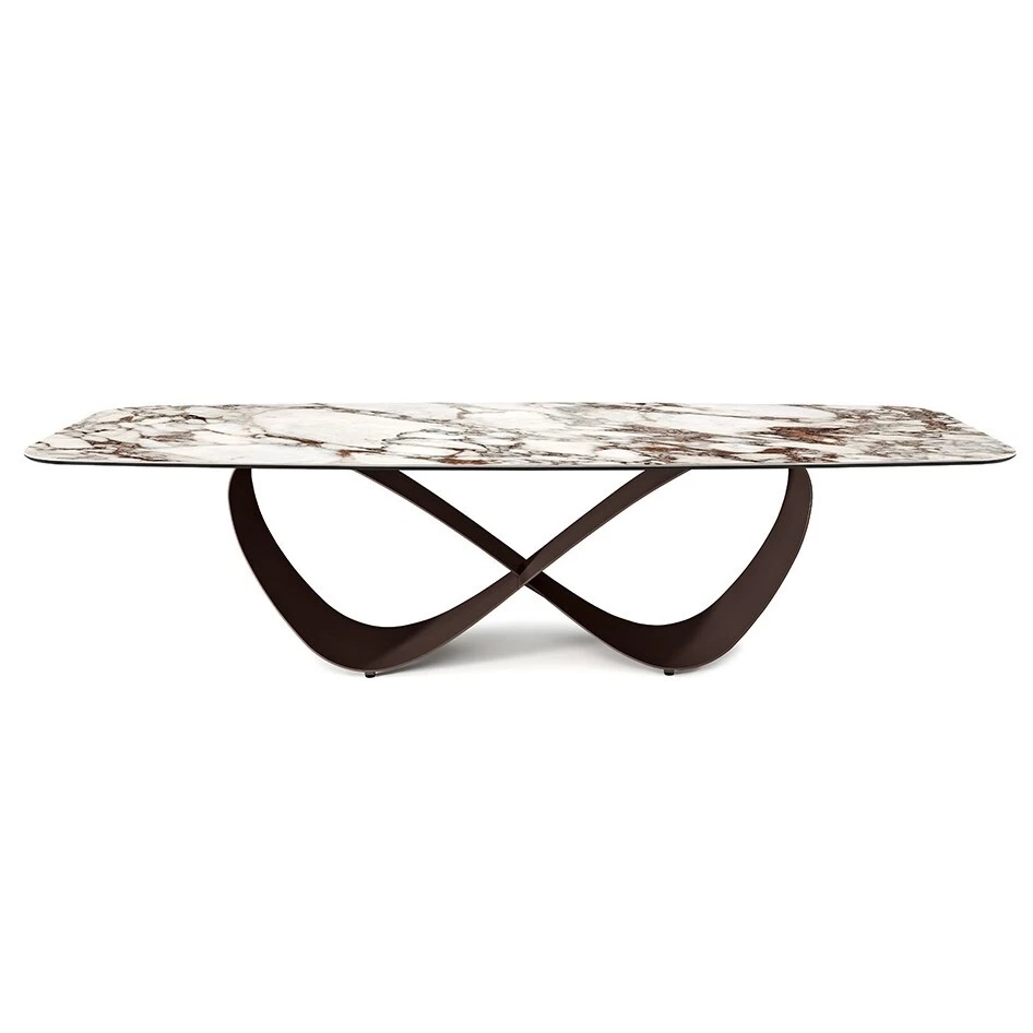 Table avec base en acier laqué embossé titane (GFM11) ou bronze (GFM18), acier laqué bronze brossé ou gris brossé. Dessus en céramique Marmi Alabastro (KM02), Supreme (KM03), Ardesia (KM04), Calacatta doré mat (KM05), Calacatta doré brillant (KM06), Portoro mat (KM07), Portoro brillant (KM08), Sahara Noir brillant (KM09), Emperador (KM10), Makalu (KM11), Breccia (KM12) ou Arenal (KM13).