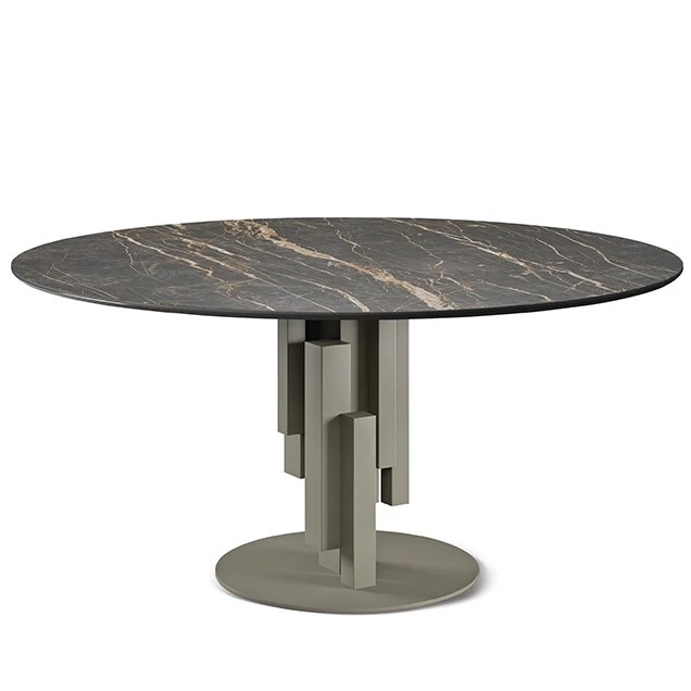 Table avec base en titane (GFM11), graphite (GFM69) ou noir (GFM73) acier laqué embossé. Dessus en céramique Marmi Alabastro (KM02), Supreme (KM03), Ardesia (KM04), Calacatta doré mat (KM05), Calacatta doré brillant (KM06), Portoro mat (KM07), Portoro brillant (KM08), Sahara Noir brillant (KM09), Emperador (KM10), Makalu (KM11), Breccia (KM12) ou Arenal (KM13).
