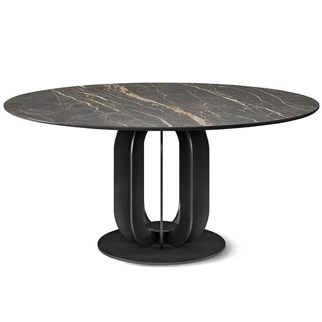 Table avec base en titane (GFM11), bronze (GFM18), graphite (GFM69) ou noir (GFM73) acier laqué embossé. Dessus en céramique Marmi Alabastro (KM02), Supreme (KM03), Ardesia (KM04), Calacatta doré mat (KM05), Calacatta doré brillant (KM06), Portoro mat (KM07), Portoro brillant (KM08), Sahara Noir brillant (KM09), Emperador (KM10), Makalu (KM11), Breccia (KM12) ou Arenal (KM13).