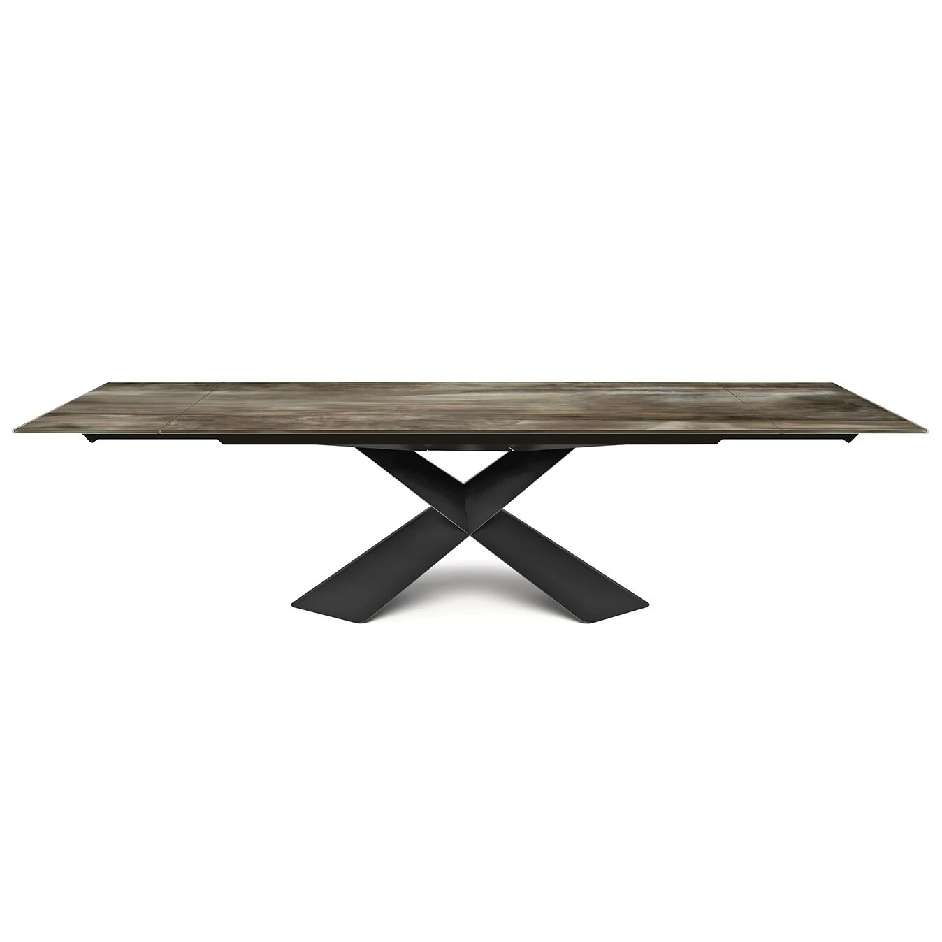 Table extensible avec base en titane (GFM11), bronze (GFM18), graphite (GFM69), acier laqué noir (GFM73), bronze brossé ou gris brossé. Dessus et rallonges en verre extra clair de 12 mm avec impression décorative artistique en deux couleurs différentes (CY01, CY02).