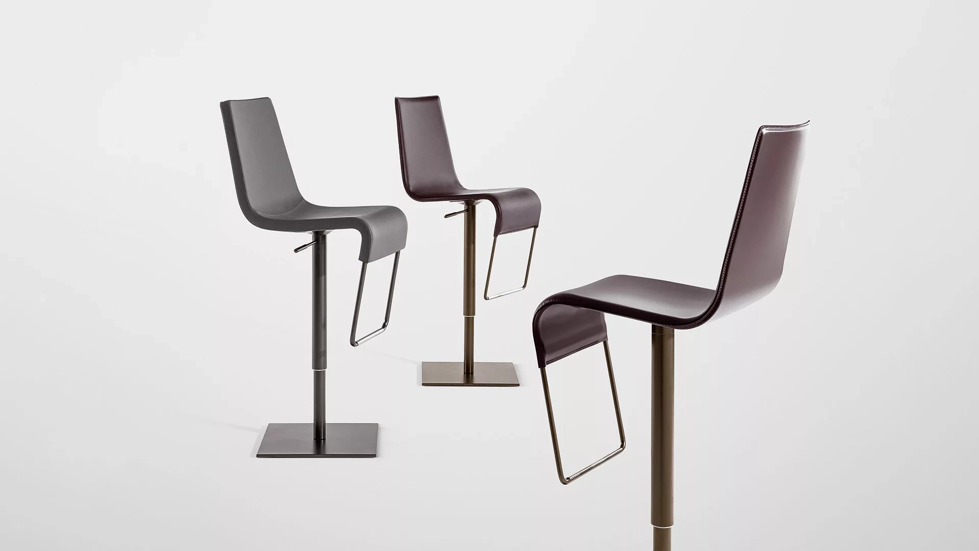 Skipping est un tabouret pivotant qui s'ajuste en hauteur grâce à un mécanisme de piston robuste. Disponible avec un revêtement en éco-cuir, en cuir ou en cuir émeri, il est particulièrement confortable grâce aux formes sinueuses du siège, avec un rembourrage en polyuréthane expansé à froid. La structure et le repose-pieds sont en acier chromé ou en acier chromé satiné. Avec sa ligne understated, curviligne mais minimaliste, qui fait écho à celle de la chaise Skip, également conçue par Karim Rashid, Skipping est accueillant et confortable et s'intègre parfaitement dans des environnements originaux, caractérisés par des atmosphères raffinées. Un signe plastique, extrêmement pur et contemporain : un objet original et fascinant qui, protagoniste de l'espace avec sa présence agile et dynamique, apparaît confortable et invitant dès le premier regard.