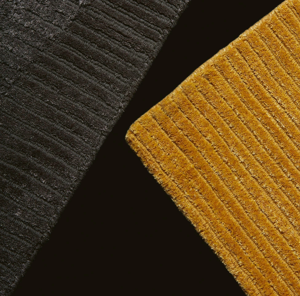 Le tapis Relief combine un effet côtelé avec une décoration de bordure, obtenue en coupant le velours à différentes hauteurs. Disponible dans les couleurs perla, cammello et tortora, il est fabriqué à partir d'un mélange de laine de l'Himalaya et de soie de bambou, une combinaison qui met en valeur la douceur et est agréable au toucher.