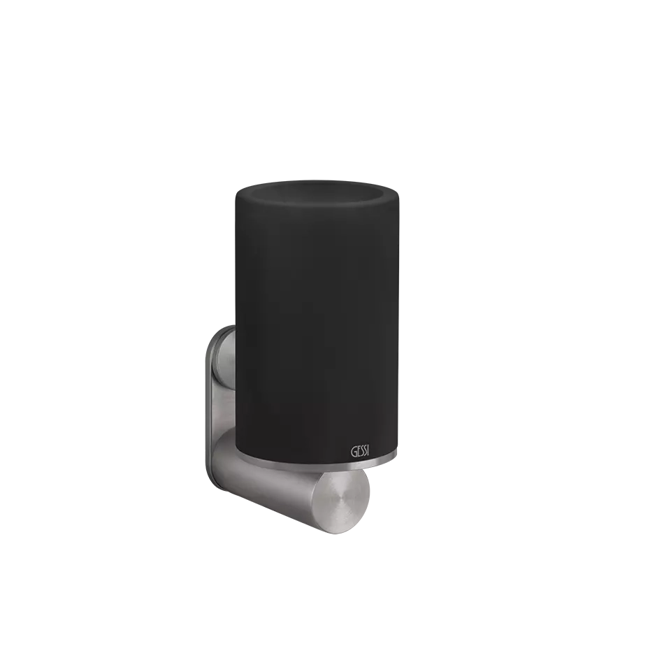 Porta bicchiere a muro nero. Con il suo esclusivo utilizzo dell'acciaio inossidabile AISI 316, la linea Gessi Gessi316 rappresenta l'apice del lusso moderno, mostrando un perfetto connubio di durata e attrattiva estetica. Questa collezione emana raffinatezza contemporanea con linee pulite e uno stile semplice che si fonde facilmente negli ambienti bagno di lusso.