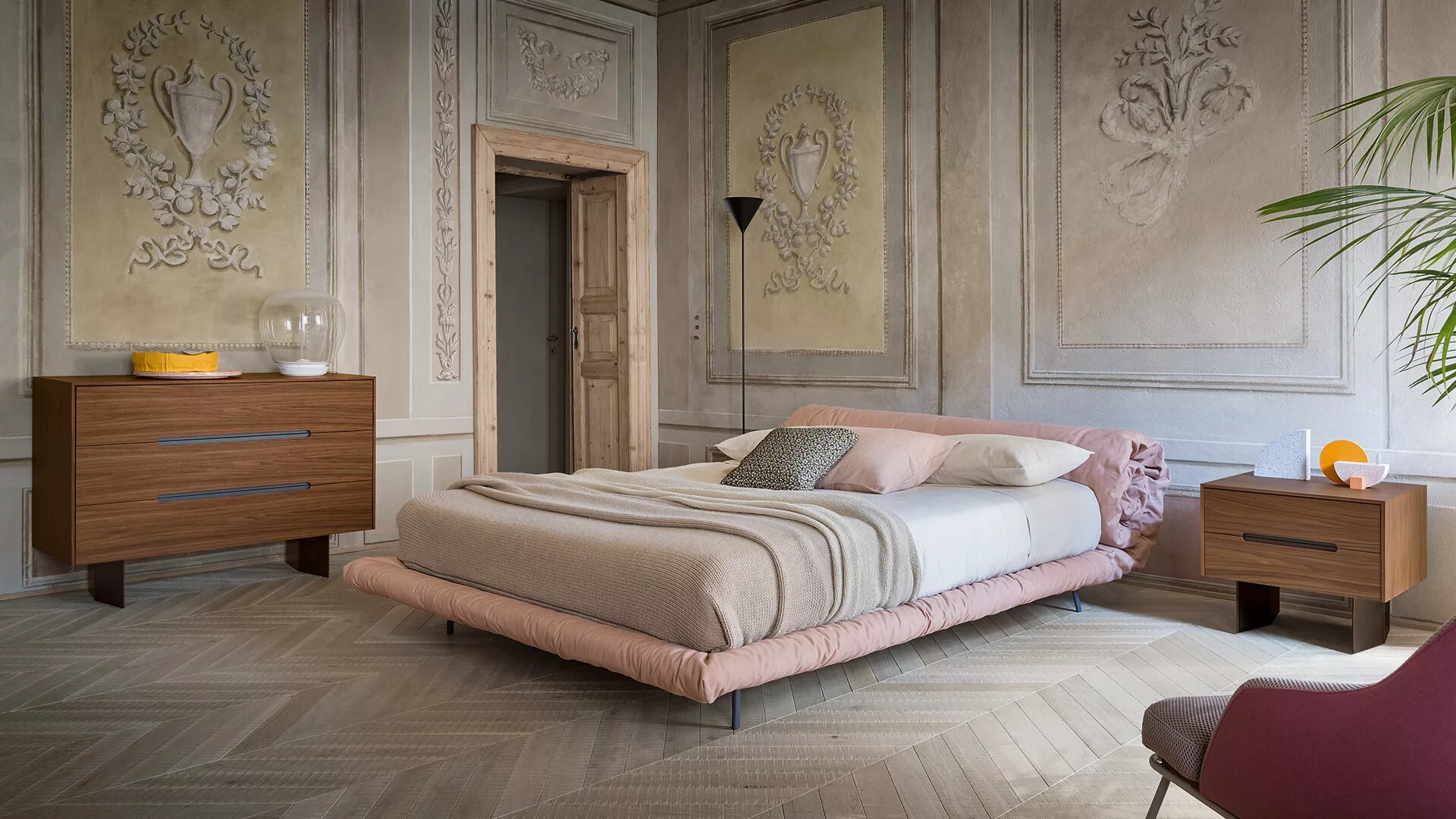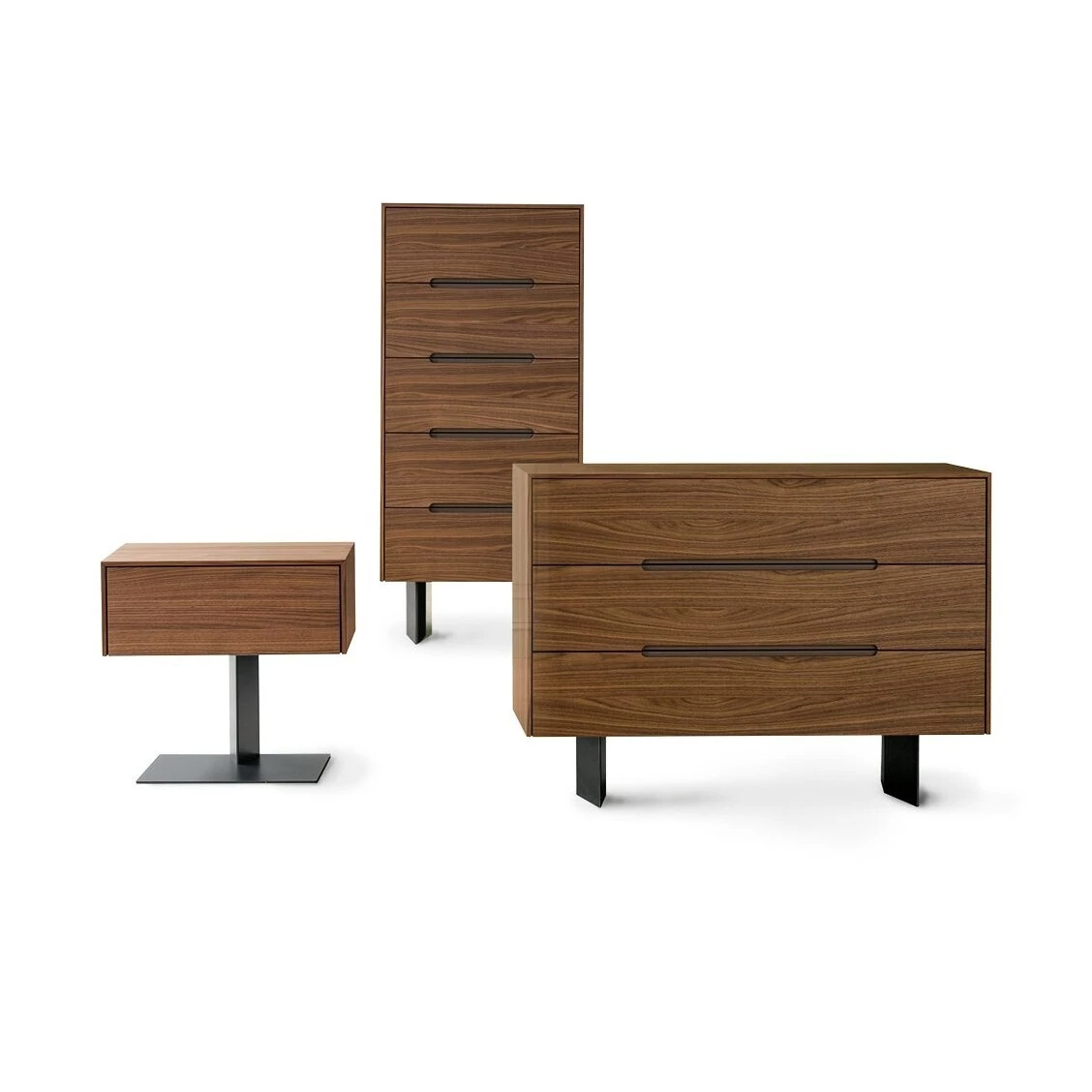 Wai è una linea di mobili per l'area notte, la forma della base della quale è stata ispirata dalle mani unite, un gesto noto come "wai", usato nel Far East per salutare e mostrare rispetto. La collezione include cassettiere, cassettone e comodino dall'aspetto sobrio e chiaro. La grande struttura rettangolare trattiene elegantemente i cassetti su cui una maniglia incassata discreta è un elemento decorativo e funzionale sofisticato. Il materiale che caratterizza Wai è il legno: nello specifico, il colore caldo e rassicurante del noce Canaletto consente a questi accessori di integrarsi perfettamente in numerosi contesti stilistici. La base, in metallo verniciato, sia grigio antracite che finitura brunita, solleva la struttura da terra in modo originale. I comodini sono prodotti in due versioni: con un cassetto e base centrale o due comodi cassetti, con doppia base laterale.