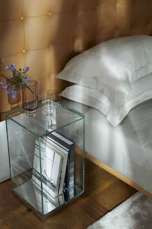 Per abbinarsi al letto progettato da Philippe Starck, il comodino Volage è un parallelepipedo in vetro extra-chiaro con base in acciaio cromato. Aperto sul fronte, può essere utilizzato come comodino o per lo stoccaggio. Il letto e una panca completano la collezione.