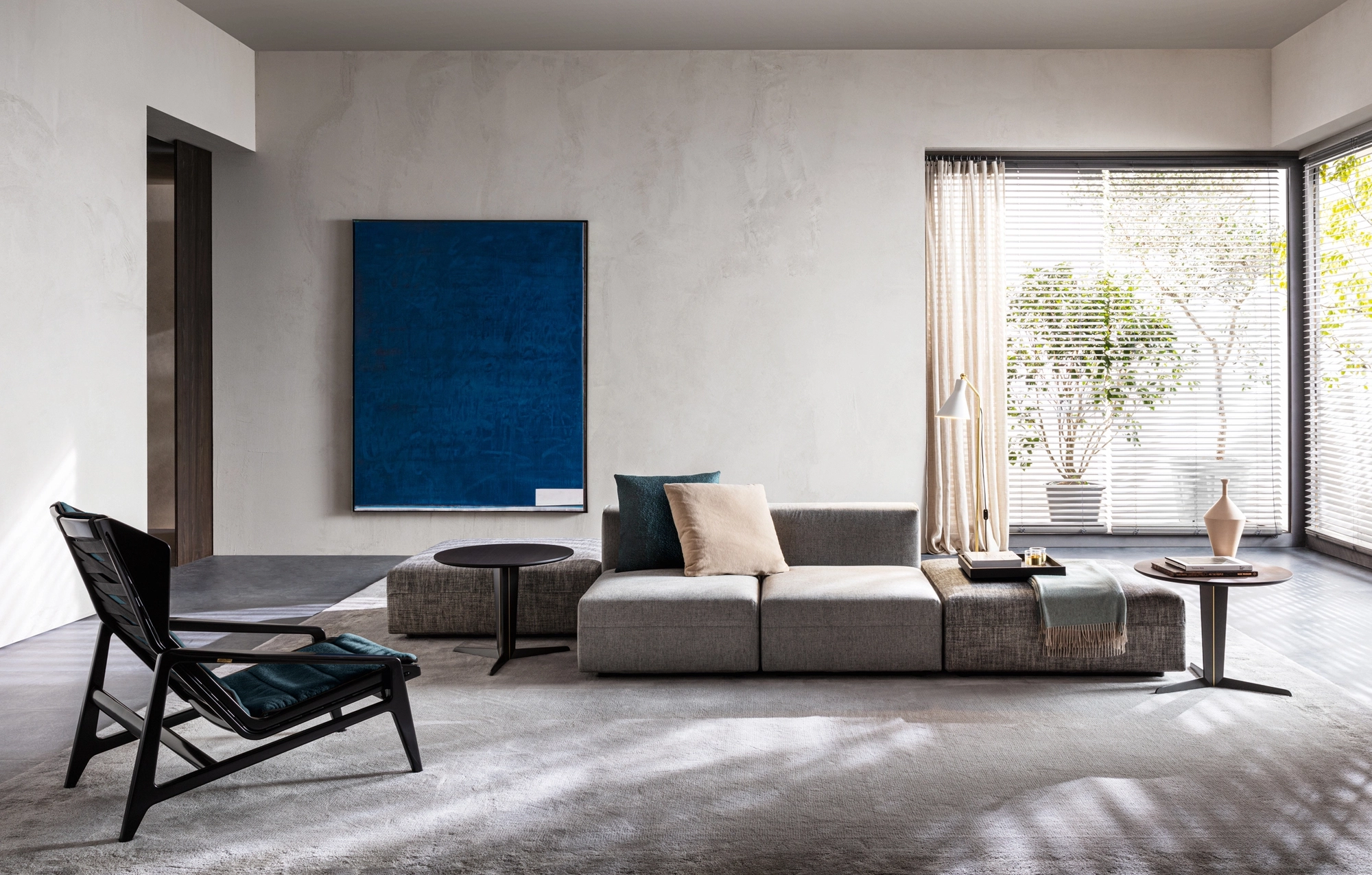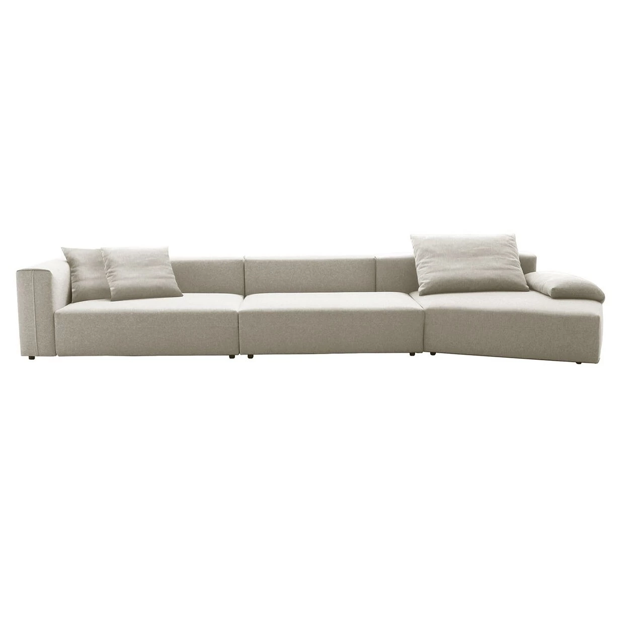 Massima modularità per questo sistema agile e versatile. Elementi lineari e d'angolo, braccioli classici o imbottiti, elementi terminali trapezoidali e unità isola, sedili e schienali di varie dimensioni per combinazioni simmetriche o asimmetriche, cuscini aggiuntivi e tessuti diversi per effetti monocromatici o in tonalità alternate.