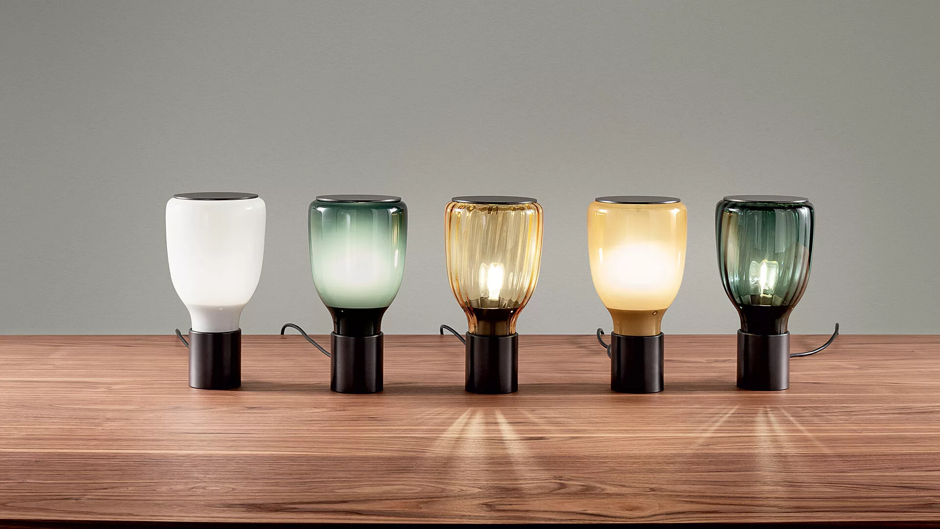 Come pennellate sovrapposte, i colori esaltano il lavoro artigianale del vetro soffiato, poiché si uniscono e si relazionano con l'ambiente circostante: la collezione di lampade Acquerelli si esprime in modelli da tavolo e sospensioni, caratterizzati dalla combinazione di paralumi in vetro e una struttura metallica verniciata in piombo opaco. Il vetro è disponibile nella finitura bianco latte o, nella versione sfumata o a righe, in elegante colore petrolio o ambra. Le lampade Acquerelli sono disponibili in due dimensioni, grande o piccola. Nella versione da tavolo, le due dimensioni corrispondono a due diverse forme di paralume. Nella versione sospensione, è disponibile anche l'opzione del doppio vetro, con il piccolo paralume combinato con il grande per creare una singola lampada a soffitto per generare sorprendenti giochi di luce.