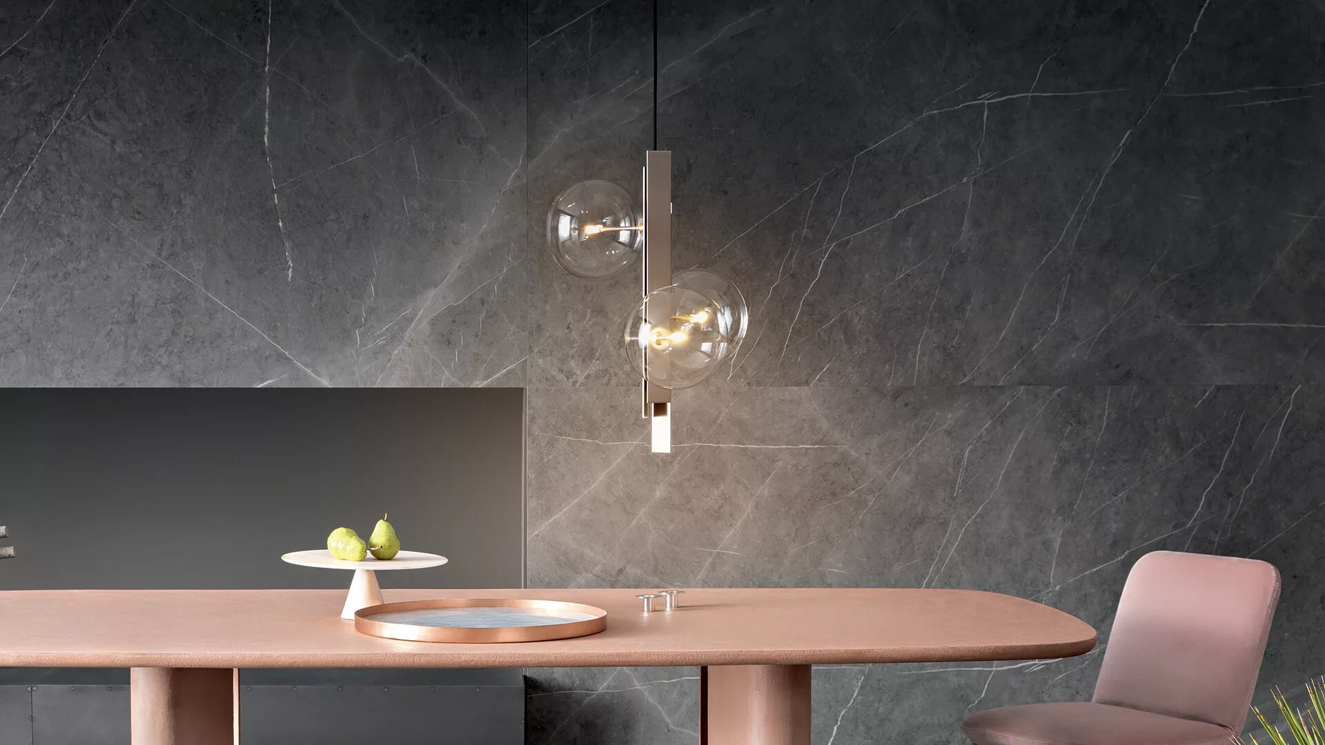 La lampada sospesa Bon Ton, progettata da Studio Team Design, si sviluppa attorno al suo asse centrale, composto da tre lame metalliche in acciaio lucido o nell'elegante finitura in rame-bronzo. È un oggetto in cui le sfere di vetro che compongono i paralumi, disponibili in vetro trasparente, ambra o fumé, sono disposte in un ordine irregolare, accentuandone la natura dinamica. Bon Ton è disponibile nella versione con una singola sfera o nelle versioni a tre o sei sfere che conferiscono ulteriore movimento alla figura della lampada.