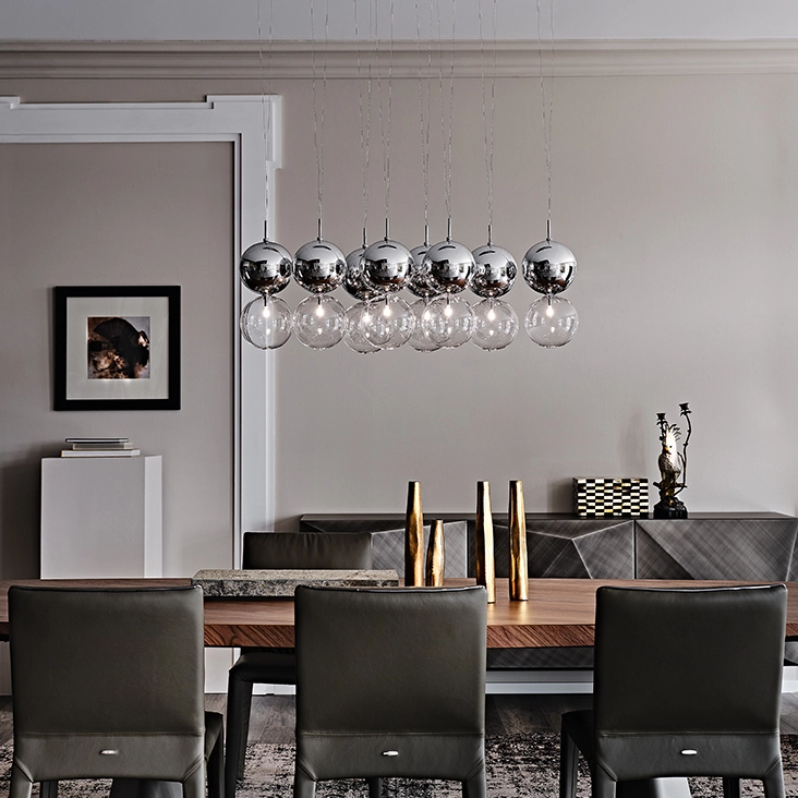 Lampada a soffitto con paralume composto da 2 sfere di vetro borosilicato. Sfera inferiore in vetro trasparente e sfera superiore in vetro trasparente o cromato, rame, bronzo. Fissaggio a soffitto in acciaio inossidabile. S1: piastra singola. S5: piastra rettangolare a soffitto per 5 paralumi. S8R: piastra rotonda a soffitto per 8 paralumi. S8ovale: piastra ovale a soffitto per 8 paralumi. Lampadina inclusa.