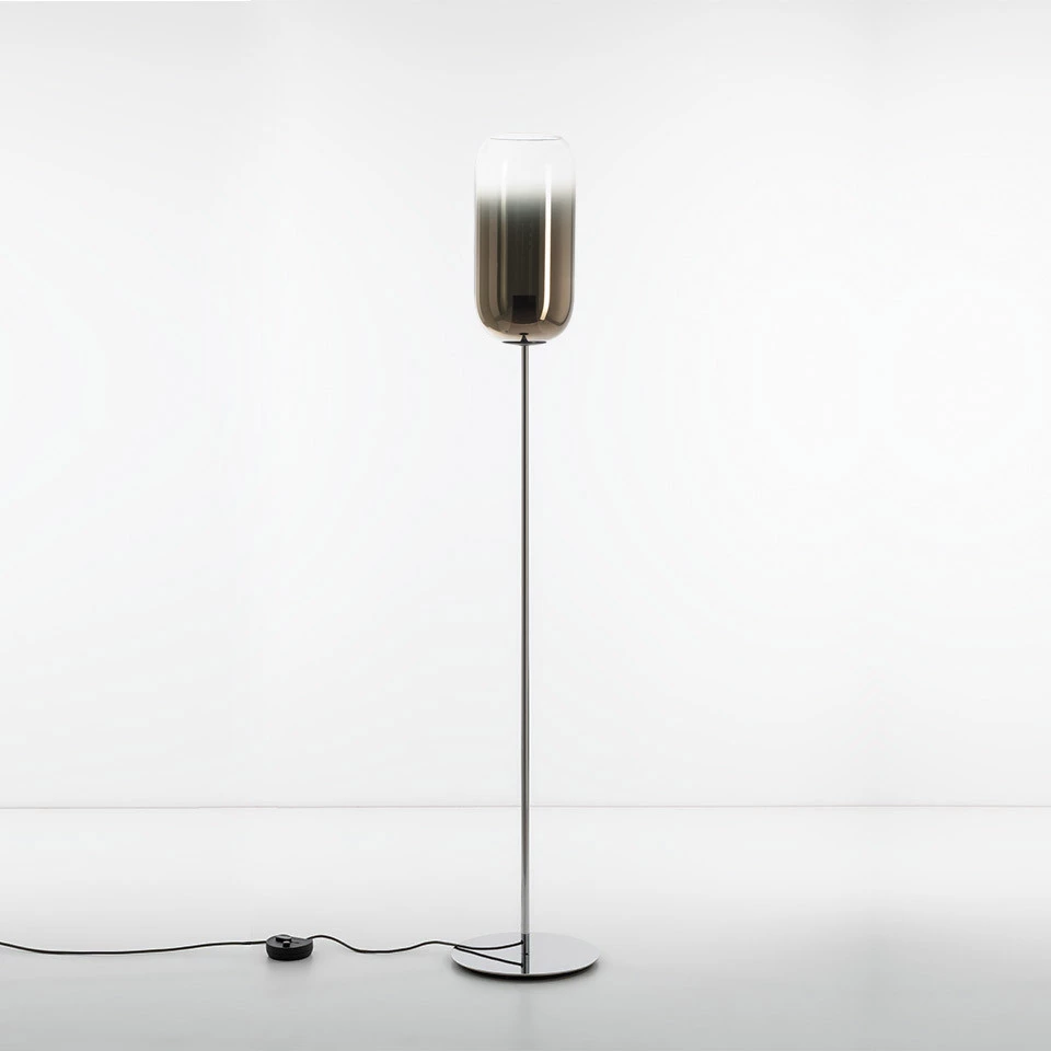 La forma base della Lampada Gople esalta la bellezza del vetro, lavorato a mano secondo un'antica tecnica veneziana che trasforma gradualmente il vetro bianco in cristallo unendo entrambi durante la soffiatura, rendendo così ogni pezzo unico. Vengono aggiunte finiture più innovative, inclusa la metallizzazione sotto vuoto argento o rame.