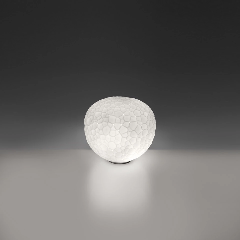 Una famiglia di lampade disponibili in cinque diverse versioni: da tavolo, da tavolo con stelo, da terra, da parete/soffitto e sospensione. Materiali: diffusore in vetro soffiato; corpo lampada in tecnopolimero. Meteorite Stem Table 15 e 35 presentano rispettivamente uno stelo in alluminio cromato e uno in acciaio. Specifica: il diffusore è composto da un doppio strato di vetro artistico, ottenuto attraverso una tecnica di soffiaggio a stampo a fermo e successiva lavorazione.