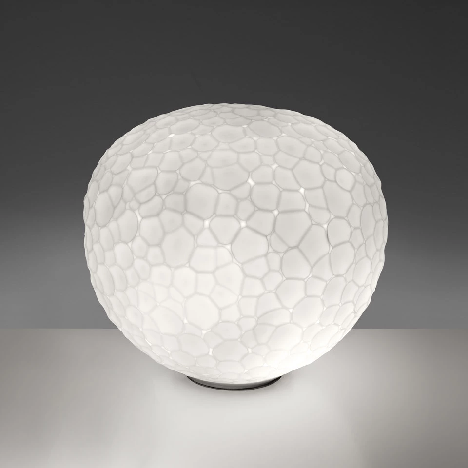 Una famiglia di lampade disponibili in cinque diverse versioni: da tavolo, da tavolo con stelo, da terra, da parete/soffitto e sospensione. Materiali: diffusore in vetro soffiato; corpo lampada in tecnopolimero. Meteorite Stem Table 15 e 35 presentano rispettivamente uno stelo in alluminio cromato e uno in acciaio. Specifica: il diffusore è composto da un doppio strato di vetro artistico, ottenuto attraverso una tecnica di soffiaggio a stampo a fermo e successiva lavorazione.