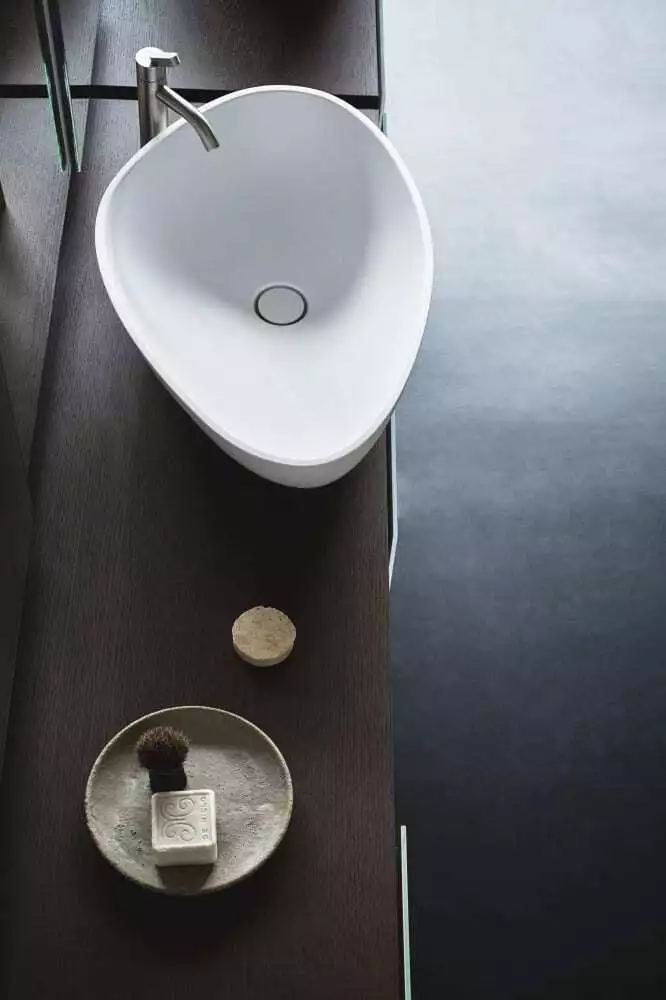 Lavabo sagomato da appoggio in Cristalplant® biobased bianco o in marmo di Carrara bianco, marmo carnic grigio o marmo Marquina nero, marmo Alpi verde o marmo Emperador scuro; senza foro per rubinetteria e troppopieno. Scarico incluso con tappo a filo con la superficie interna del lavabo, nella stessa finitura del lavabo (.MET0723).