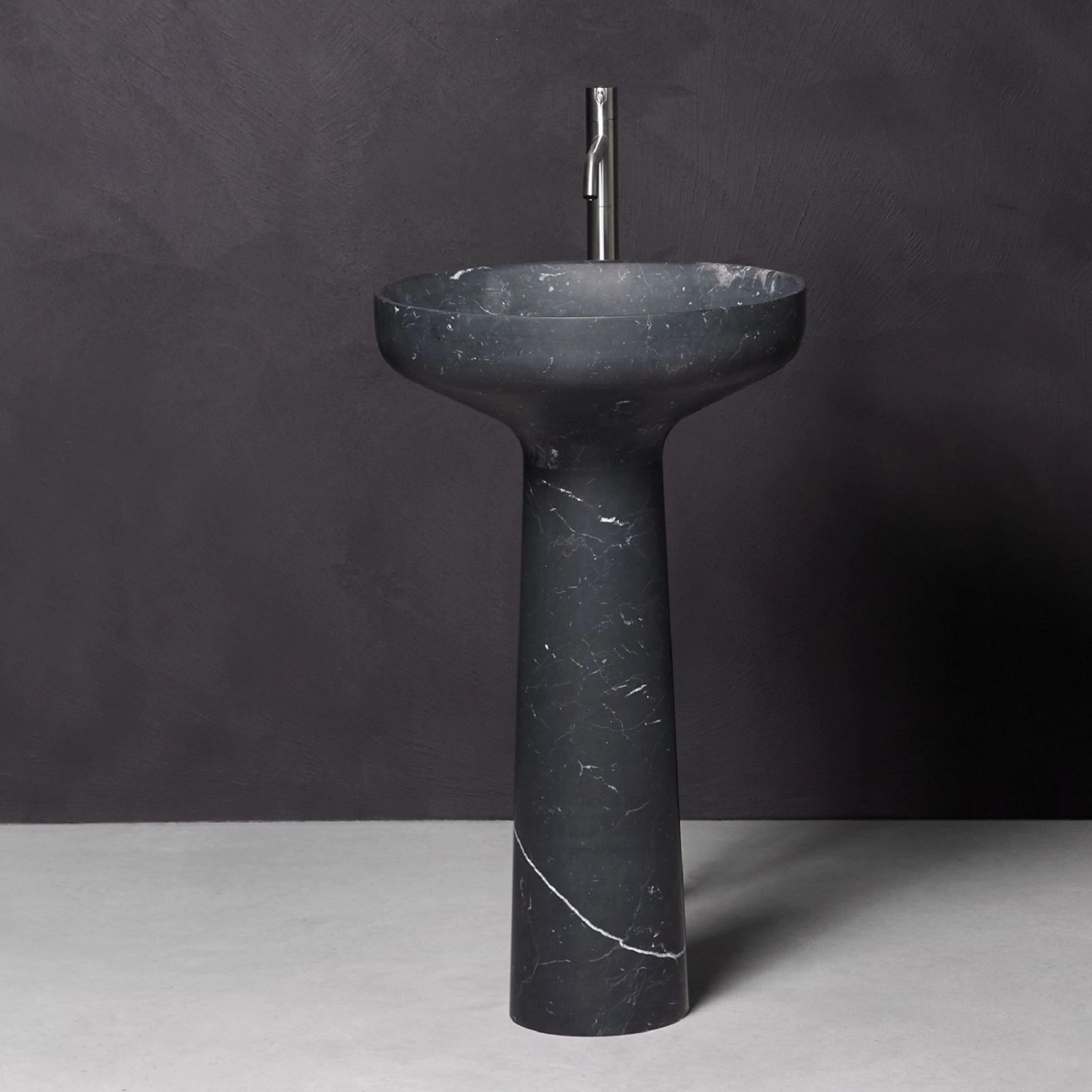 È la sintesi armoniosa di volumi essenziali, è l'incontro virtuoso tra la geometria perfetta del lavabo circolare con bordi sottili e la base cilindrica che si restringe verso l'alto. Proprio la delicatezza con cui risolve la connessione tra la base e il lavabo è la caratteristica essenziale della collezione, e in particolare di questo lavabo freestanding che diventa il fulcro di un bagno contemporaneo e trasversale.