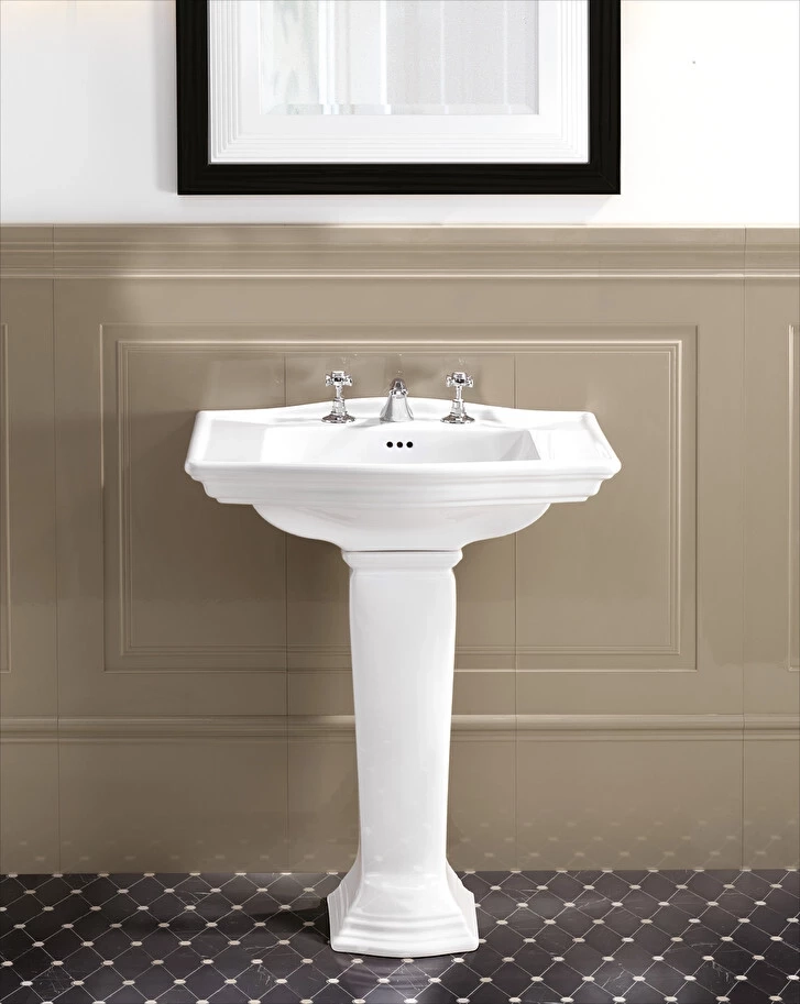 La quintessenza del classicismo per un lavabo con piedistallo in pregiata porcellana bianca, ispirato allo stile britannico più puro. È disponibile nelle versioni con 1, 2 o 3 fori.