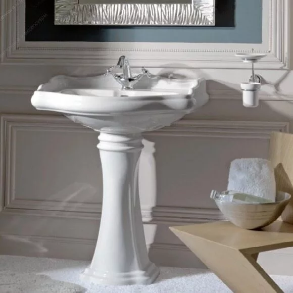 Un lavabo con un foro 69 (tre fori su richiesta). Per un bagno di classe, che richiama il gusto e lo stile vintage, il lavabo da 69 cm con piedistallo della collezione Retro di Kerasan è la soluzione ideale.