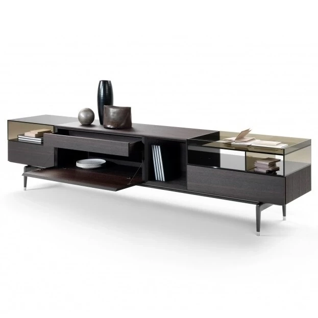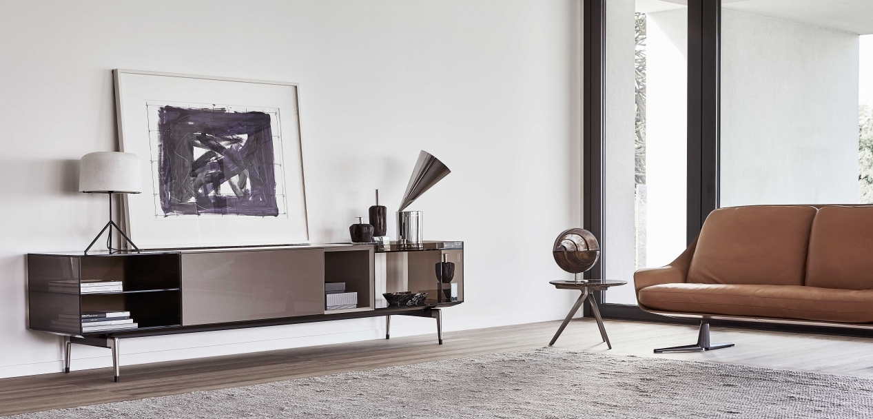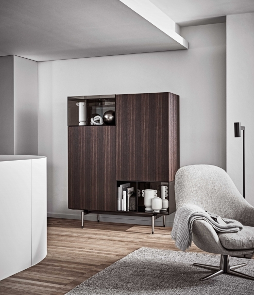 Rivelare o nascondere è la domanda che ha ispirato l'estetica della famiglia di armadi Jeremy. Caratterizzati da linee pure e proporzioni eleganti che si basano su un'alternanza ritmica di spazi negativi e positivi, offrono una serie di scomparti aperti per esporre oggetti preziosi e scomparti chiusi con ante a ribalta. Particolarmente affascinante è il contrasto tra la leggerezza dei scomparti in vetro fumé e la superficie testurizzata della quercia cotta. Gli armadi Jeremy sono disponibili anche in finitura laccata lucida in tre colori: bianco, grigio tortora o nero; e poggiati su eleganti piedini in alluminio pressofuso con finitura brunita o satinata. La famiglia Jeremy include composizioni con cassetti e ante a ribalta, con vari accessori, ognuno dei quali è progettato per essere posizionato in diverse parti della casa, dall'ingresso al soggiorno. Tutti gli elementi sono rifiniti sul retro, rendendoli adatti come divisori di ambienti.