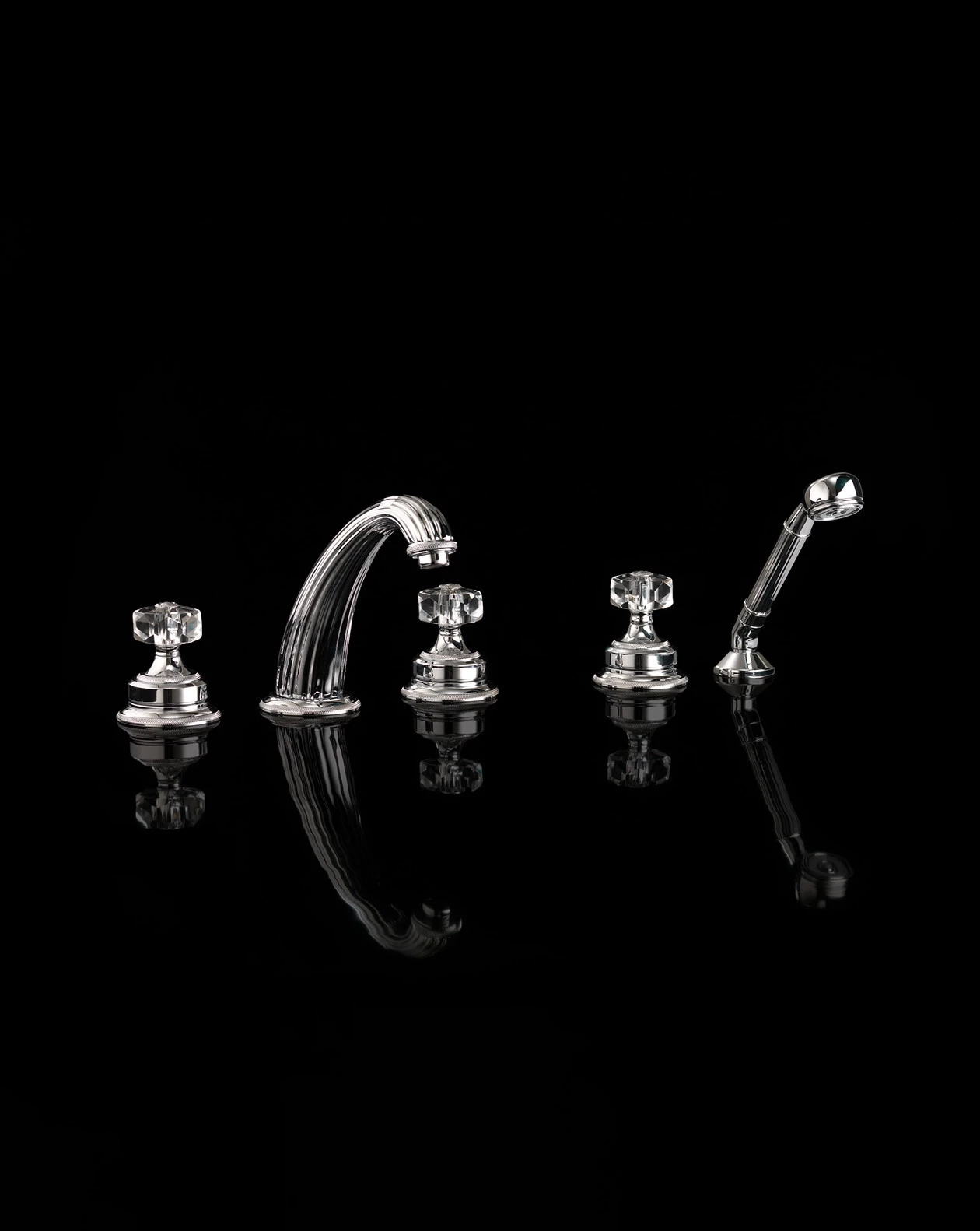 Opere di finissima artigianalità, dettagli preziosi e sofisticate caratteristiche retrò per un miscelatore per vasca a 5 fori montato sul bordo con deviatore e doccetta ideale per bagni molto eleganti. Essendo in ottone, è disponibile nelle seguenti finiture: cromo, nichel lucido, ottone antico e oro 24 carati.