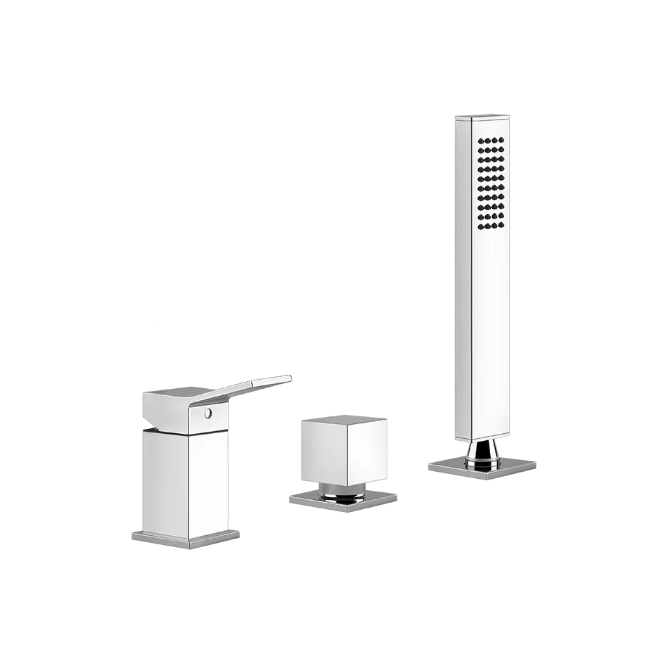Miscelatore per vasca a tre fori con deviatore nella bocca, flessibile da 1,50 m e doccetta anticalcare. Gessi osa andare oltre il solito e rafforzato, schiacciando la forma del Rettangolo con un taglio obliquo, una linea diagonale che lo spezza e ne cambia la silhouette, ridisegnando il suo contorno iconico evocando una "K". Il risultato è sorprendente: l'oggetto conserva la sua armonia originale, ma è nuovo, diverso e bello.