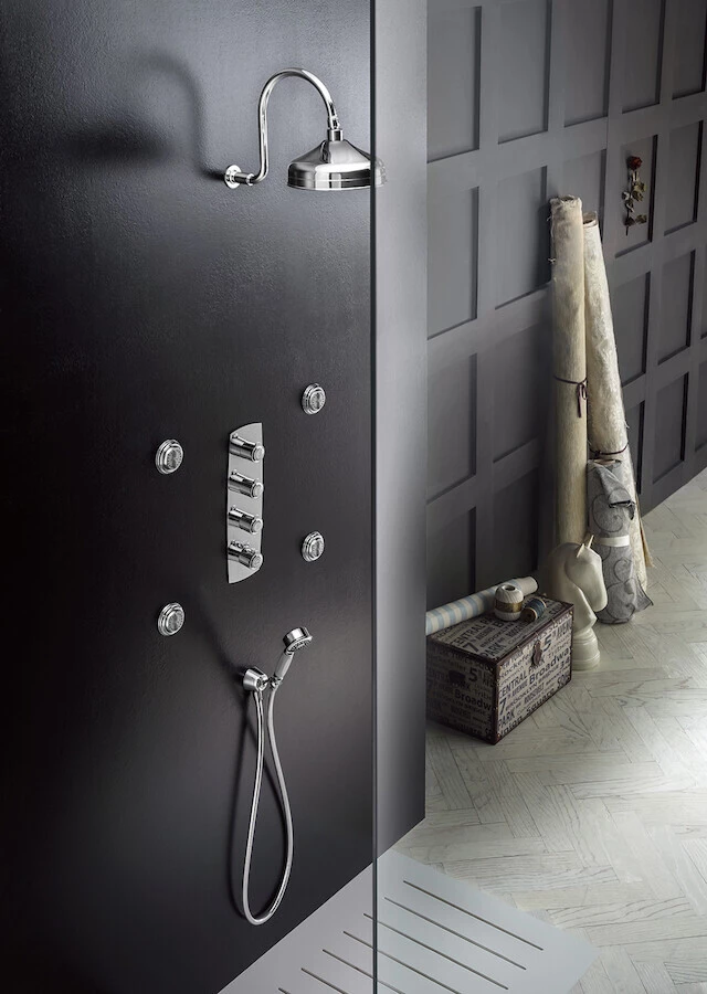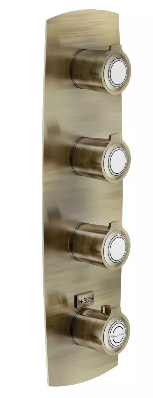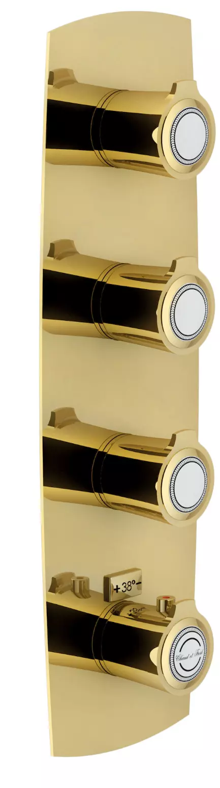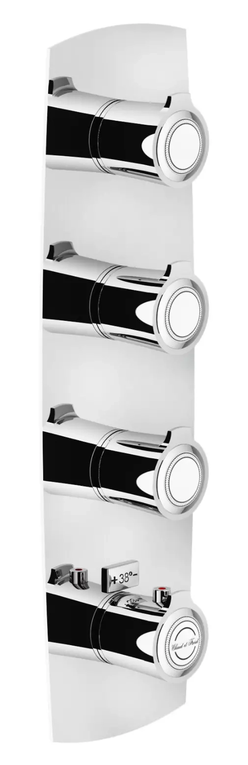Portamento maestoso, stile solenne: una serie continua di curve morbide e spigoli netti. Tendenza classica, eleganza raffinata: Sofì reinventa la storia dell'arte e propone un favoloso incontro di gusti lontani e ispirazioni moderne all'interno del bagno. MISCELATORE TERMOSTATICO AD INCASSO, PARTE ESTERNA 3 VIE. Blocco di sicurezza a 38° C Montaggio verticale o orizzontale