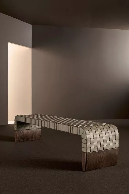 La semplicità del design è pienamente in linea con la particolare intrecciatura in pelle che adorna la seduta. Le larghe cinghie spesse 2 mm, decorate lungo tutta la loro lunghezza con segni a mano, creano un motivo sia geometrico che tattile. L'effetto complessivo, lineare e sofisticato, è estremamente contemporaneo.