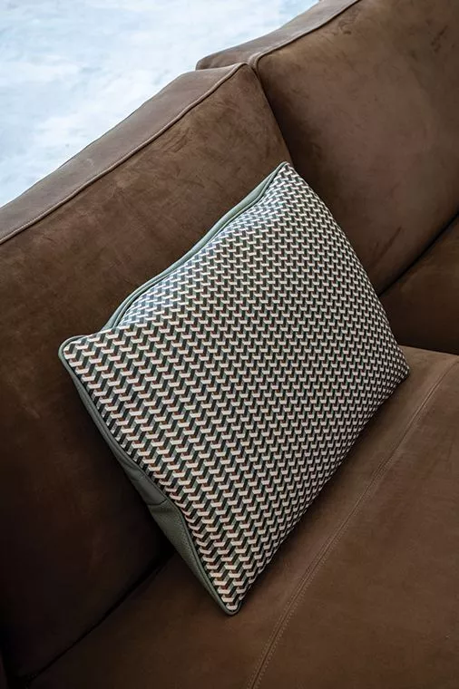 Poltrona Frau offre una vasta gamma di cuscini decorativi per spazi interni. Un'aggiunta ai raffinati tessuti in lino, seta e velluto e alla vasta gamma di tappezzerie in Pelle Frau® è il Pelle Frau® Motif Weavers, una decorazione in pelle multicolore stampata digitalmente che richiama il mondo della tessitura, del vimini e della cesteria. Sono disponibili due varianti di colore, Salvia e Cannella. Entrambi i colori possono essere abbinati alla pelle Pelle Frau® ColorSphere®, l'alfabeto dei colori che consente a Poltrona Frau di armonizzare i suoi accessori d'arredo in tutta la gamma attraverso colori e materiali.