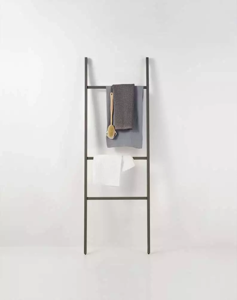 Elementi con usi diversi (portasciugamani, portasciugamani con ripiani o elementi con cinque ripiani) in impiallacciatura di rovere chiaro, naturale, medio, marrone o scuro o in legno ricostruito, finitura teak o verniciato bianco o grigio, a pavimento e appoggiati al muro.