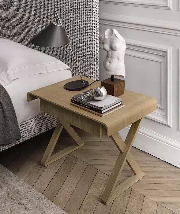 Questo piccolo e raffinato tavolino da servizio in legno con cassetto, si distingue per il contrasto armonioso tra la struttura geometrica a forma di X e il piano avvolgente che si piega sulle gambe ai lati.