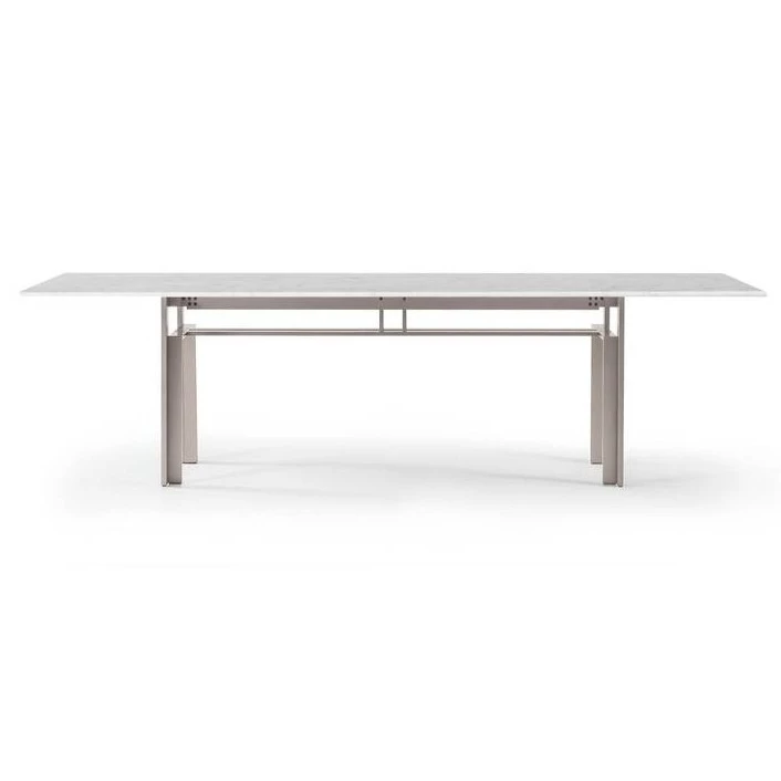 Un vero capolavoro della tradizione del design italiano, questo tavolo scultoreo divenne, alla fine degli anni '60, l'emblema del movimento "Ultrarazionale" che, scrollandosi di dosso i vincoli imposti dai Razionalisti, mirava a riabbracciare i valori estetici tradizionali. Parte della Collezione Simon di Cassina, il tavolo Doge è stato rivisitato con nuove texture e nuovi materiali. La base architettonica in alluminio o acciaio satinato, valorizzata dai profili piatti e larghi, è la parte essenziale del tavolo, mentre il meccanismo elegantemente raffinato che collega il piano alla base può essere visto dall'alto, attraverso il vetro del piano del tavolo. Il nuovo look del tavolo Doge è disponibile in cinque dimensioni, tutte ispirate al design originale di Carlo Scarpa, con il piano del tavolo disponibile in vetro float, così come marmo bianco Carrara o marmo nero Marquiña.