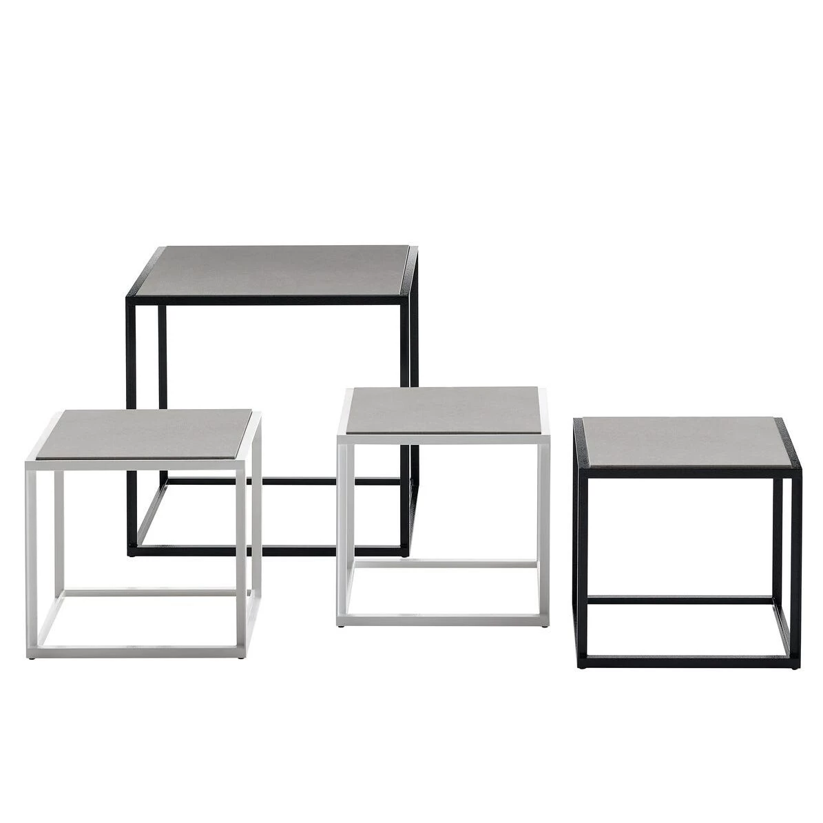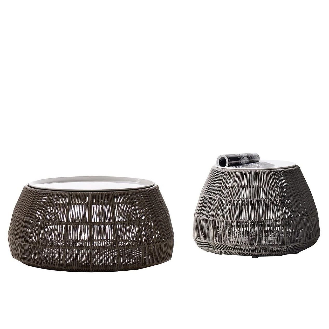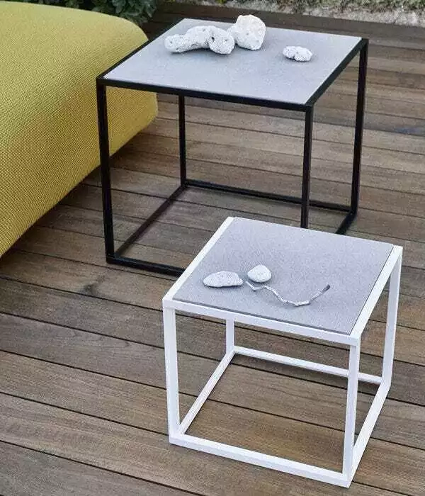 I tavolini Canasta '13 per uso esterno completano la famiglia di sedute dello stesso nome e sono così flessibili da adattarsi a qualsiasi ambiente in cui sia necessario un tavolo. Sono disponibili in due versioni: la prima, un modello decorativo con forme morbide, presenta una struttura caratterizzata da fasce intrecciate in polietilene colorato e un piano in acciaio verniciato; la seconda, più minimalista e geometrica, ha una struttura in acciaio verniciato a polvere e un piano in gres porcellanato.