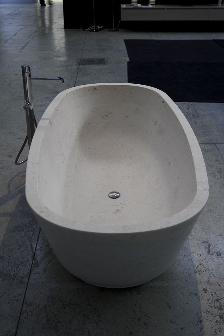 Vasca da bagno ovale in pietra, completa di piletta con sistema di scarico a pressione clik-clak. Peso vasca: 800 Kg ca..Delivery: 8-12 weeks