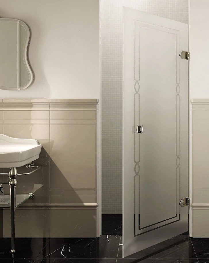 Brak mocowanych do ściany pionowych filarów podkreśla absolutnie czysty design drzwi prysznicowych, które doskonale pasują do każdego otoczenia. Mocowane do ściany zawiasy i diamentowe gałki kryształowe są dostępne w wykończeniu chromowanym lub złotym. Przezroczyste, matowe lub ozdobione szkło można dostosować na życzenie z rysunkami, inicjałami lub logotypami.