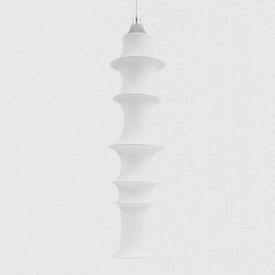 Falkland suspension to lampa o spontanicznym kształcie, który jest osiągany przez przeciwstawne siły jego składników: napięcie rozciągniętej rury z drobno tkanej tkaniny i ciężar siedmiu różnych rozmiarów metalowych pierścieni. Jedna żarówka i reflektor z aluminium oświetlają krzywe tkaniny.
