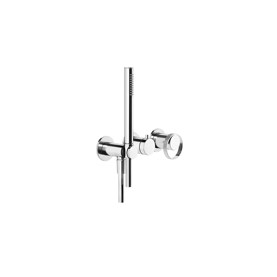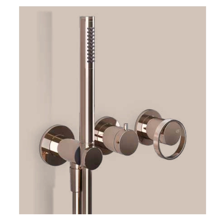 Zewnętrzne części do ściennej baterii prysznicowej, dwukierunkowej, przełącznik, wylot wody, haczyk na prysznic. Kolekcja Anello ma liczne warianty dostaw wody, a każdy akcesorium łazienkowe jest odpowiednio skoordynowany. Anello prezentuje nietypowe wykończenia i wzory, wzmacniając design, uważany także za alternatywę dla metalowych powierzchni, które jesteśmy przyzwyczajeni widzieć w dziedzinie designu. Nowa kolekcja Anello od Gessi, wyrafinowana i konkretne, interpretuje współczesną, intensywną kobietę świadomą swojego uroku, która zdobywa scenę dzięki miękkości swoich form.