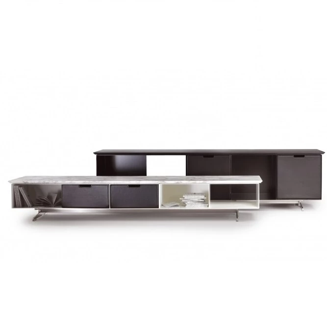 Rozległa rodzina Fly, oprócz licznych stołów jadalnych, kawowych i bocznych, obejmuje również dwie niskie konsolki zaprojektowane do salonu. Konsolki Fly, lekkie i przestronne, posiadają metalową konstrukcję pokrytą proszkową emalią wewnątrz i na zewnątrz w szerokiej gamie wyrafinowanych odcieni. Stopy, również wykonane z metalu, mają ten sam design co te używane do stołów, podczas gdy blaty występują w różnych rodzajach marmuru. Konsolki Fly są doskonałym miejscem do wyświetlania koszyków Box z naturalnej skóry, dostępnych w kilku kolorach.