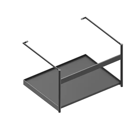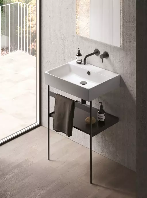 Satynowa czarna metalowa rama wisząca z półką. Nowa seria Green, inspirowana morfologicznymi zasadami natury, charakteryzuje się ciągłymi krzywiznami i cienkimi krawędziami. Intymny związek między kształtem, materiałami i funkcją, gdzie każda grubość i proporcja wydają się niezbędne.