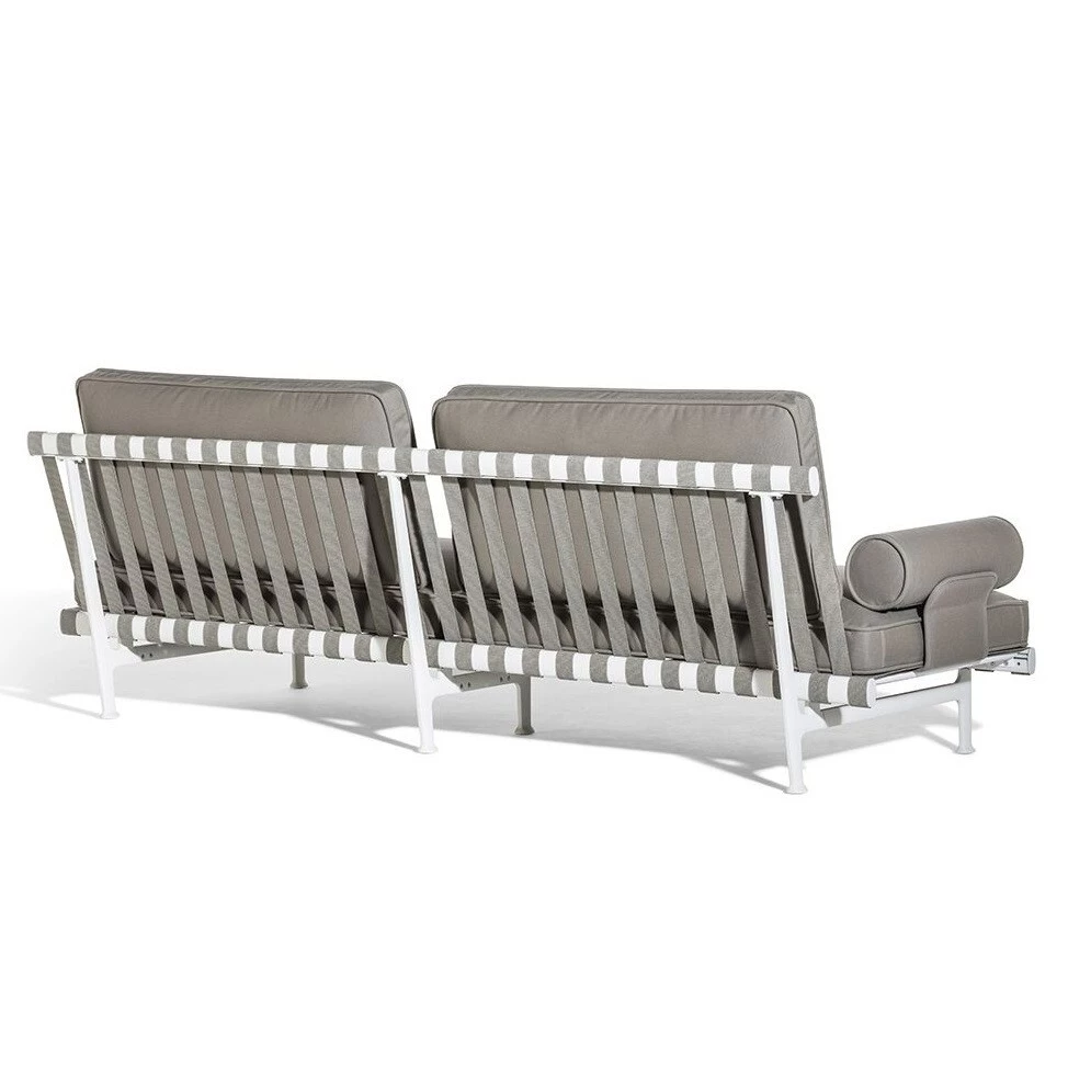 Dwuosobowa sofa zewnętrzna z kolekcji Souvenir d'Italie, zaprojektowana przez Ludovicę + Roberto Palomba, charakteryzuje się lekkością i nieformalnym komfortem. O dużych rozmiarach, ma prosty design, który interpretuje dwa archetypy mebli zewnętrznych: metal i plecione paski. Elastyczne paski z włókna polipropylenowego punktują powierzchnię siedziska i oparcia pełnymi i pustymi przestrzeniami, tworząc obraz lekkości i przezroczystości. Lekkość ta jest również podkreślana przez odlewane stopy podpierające z aluminium, które sprawiają, że sofa wydaje się zawieszona nad ziemią. Wspierająca konstrukcja, z aluminium ekstrudowanego, składa się z trzech podłużnych belek o owalnym przekroju, które tworzą "L", owinięte w motyw stworzony przez paski. Poduszki składają się z dużych "materacy", podkreślonych wyraźnymi lamówkami, które rysują ich sylwetkę. Są umieszczone bezpośrednio na tkanej konstrukcji, nie ukrywając jej. Wypełnienie to dwuwarstwowa pianka poliuretanowa odprowadzająca, zaprojektowana specjalnie do mebli zewnętrznych. Aby przywołać ideę ławki ogrodowej, podłokietniki są uproszczone do dwóch cylindrów, podtrzymywanych tylko przez tapicerowane metalowe wsporniki w połączeniu z poduszkami. Sofa przywodzi na myśl bardziej swobodną i mniej formalną koncepcję komfortu, typową dla użytku na zewnątrz. Do urządzenia ogrodów, stref przy basenie, tarasów lub pokładów statków, zarówno w ustawieniach mieszkalnych, jak i kontraktowych. Kolekcja Souvenir d'Italie została zaprojektowana tak, aby pasować do wykończeń i kolorów kolekcji mebli ogrodowych Poltrona Frau Boundless Living, tworząc środowiska bez granic, z włoskim savoir-vivre.