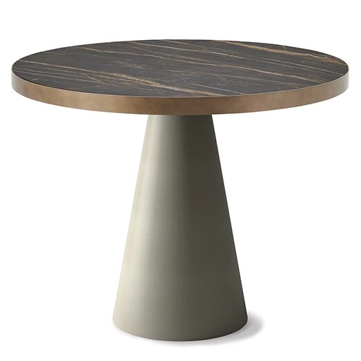 Stół bistro z podstawą z tytanu (GFM11), grafitu (GFM69) lub czarnej (GFM73) lakierowanej stali i ramą blatu z tytanu (GFM11), grafitu (GFM69) lub czarnej (GFM73) lakierowanej stali lub szczotkowanego brązu. Blat ceramiczny z marmuru Alabastro (KM02), Ardesia (KM04), matowego Portoro (KM07), błyszczącego Portoro (KM08), Emperador (KM10), Makalu (KM11) lub Arenal (KM13).